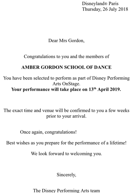 Letter of Acceptance from Disney Performing Arts 26/7/2018
